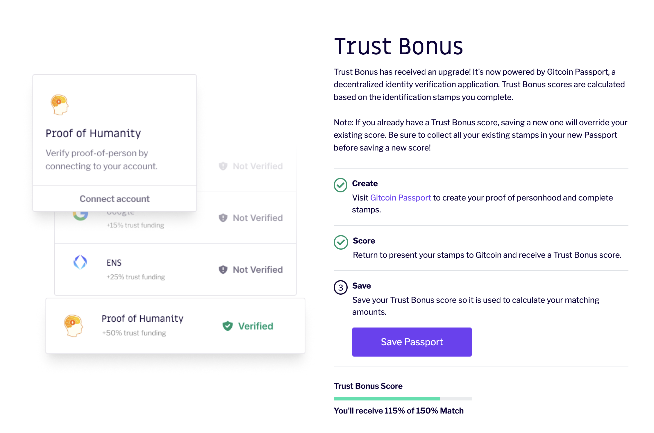 To build in Sybil resistance, the Gitcoin team asks users to verify their “proof of humanity” by proving ownership over various accounts and data. Gitcoin Grants integrates with a variety of identity providers (Proof of Humanity or BrightID), Web2 services (Google, Twitter, or Facebook), and Web3 accounts (ENS). Users who verify their identity through a number of these mechanisms are eligible for a ‘Trust Bonus,’ allowing their contributions to be assigned a larger weight in the matching calculations.