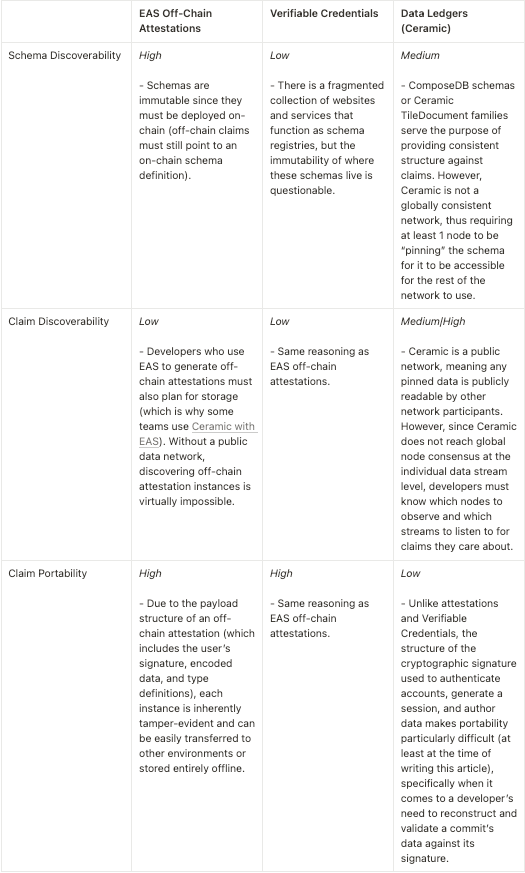 Given this brief comparison, it’s easy to understand why many teams choose to build high-portability claim types like Verifiable Credentials on top of a public data network like Ceramic. This combination works in complimentary fashion to enable easy portability and verifiability (when using a framework), alongside the availability and discoverability benefits of a network.