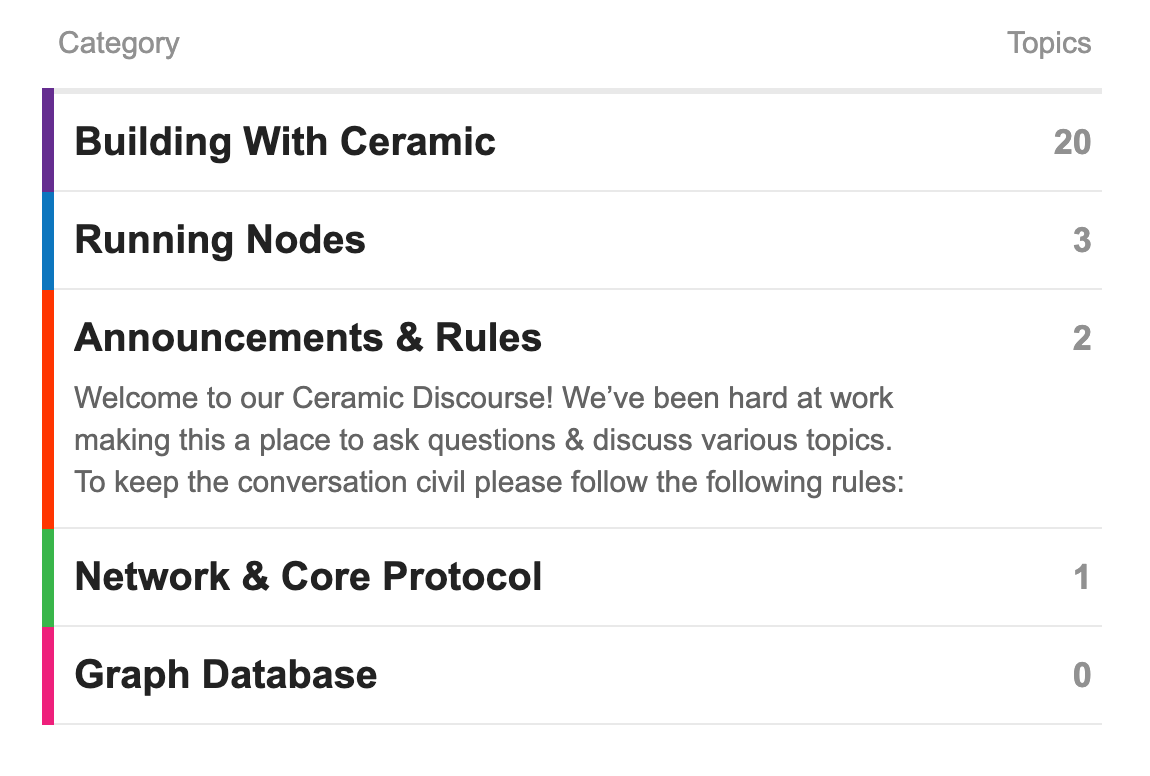If you have been a part of Ceramic’s developer community for a while, you probably know that we've been exchanging knowledge and receiving updates from the Ceramic core team on a Ceramic Discord Server. One piece of feedback we received from multiple members of the community is that, over time, the RSS feed-like nature of Discord made it difficult to get answers to technical questions and search for information. It became clear that we need a better platform for facilitating technical support and empowering our developer community to share technical knowledge about Ceramic.