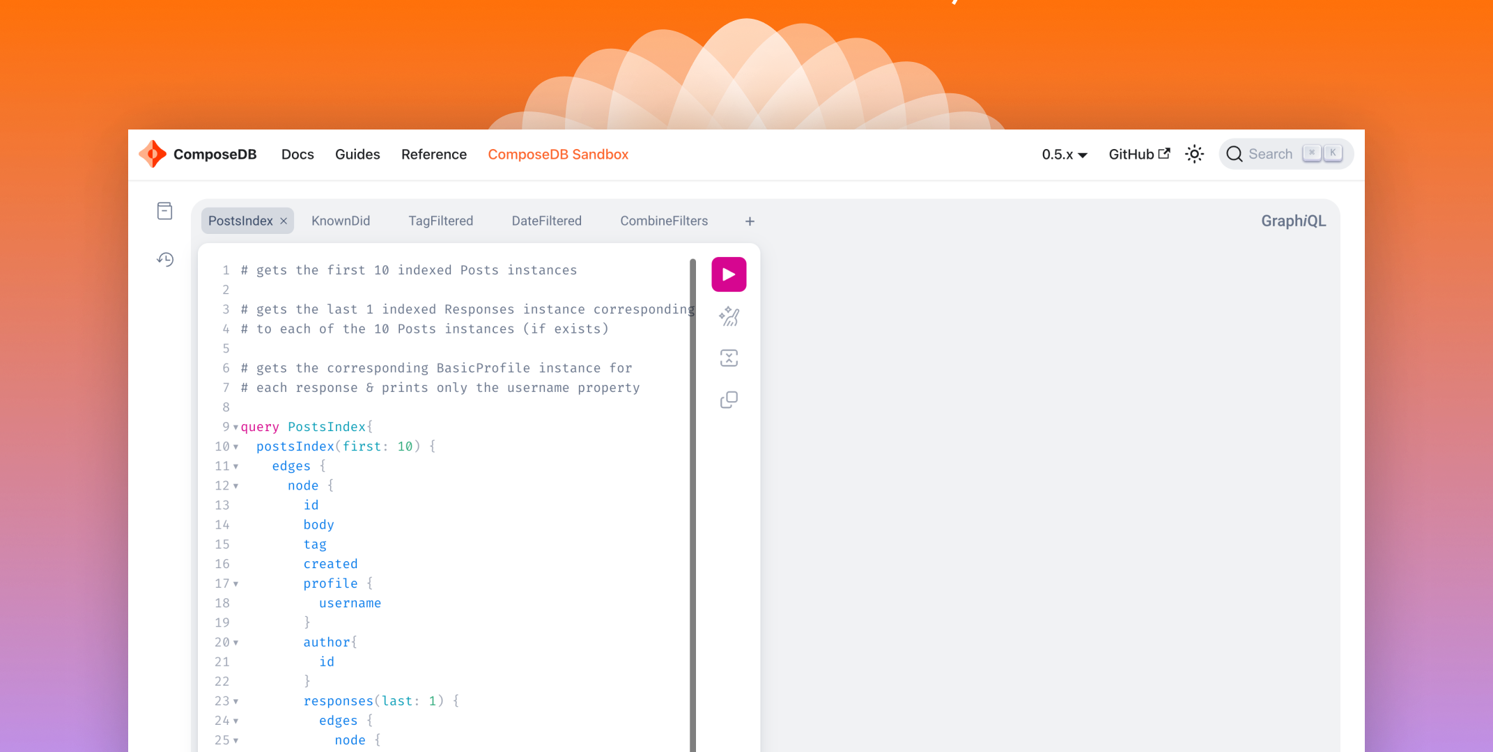 ComposeDB Sandbox is an awesome no-hassle way to try ComposeDB's GraphQL API without needing to install anything. While playing in the sandbox, you'll also notice that ComposeDB now supports query filtering and ordering, which allows developers to filter and/or order the results of their data queries.