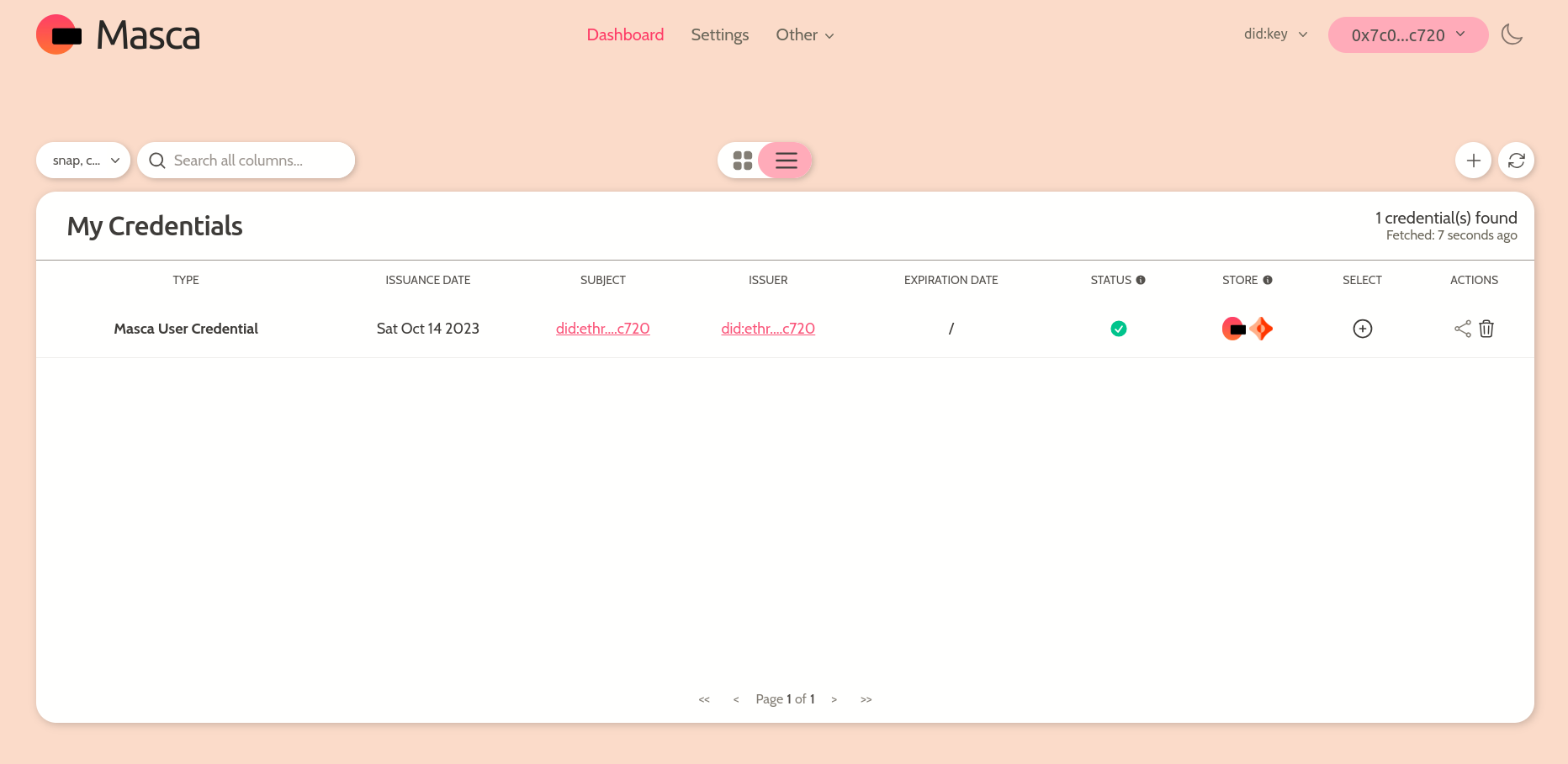 Masca uses Veramo Client for DID management, as well as for the creation, presentation, and validation of Verifiable Credentials. In alignment with Masca’s mission, the snap also offers flexibility around data storage, allowing users to toggle between the local MetaMask Snap state (which exists fully off-chain and exclusively in the user’s browser), as well as storage on the Ceramic Network.