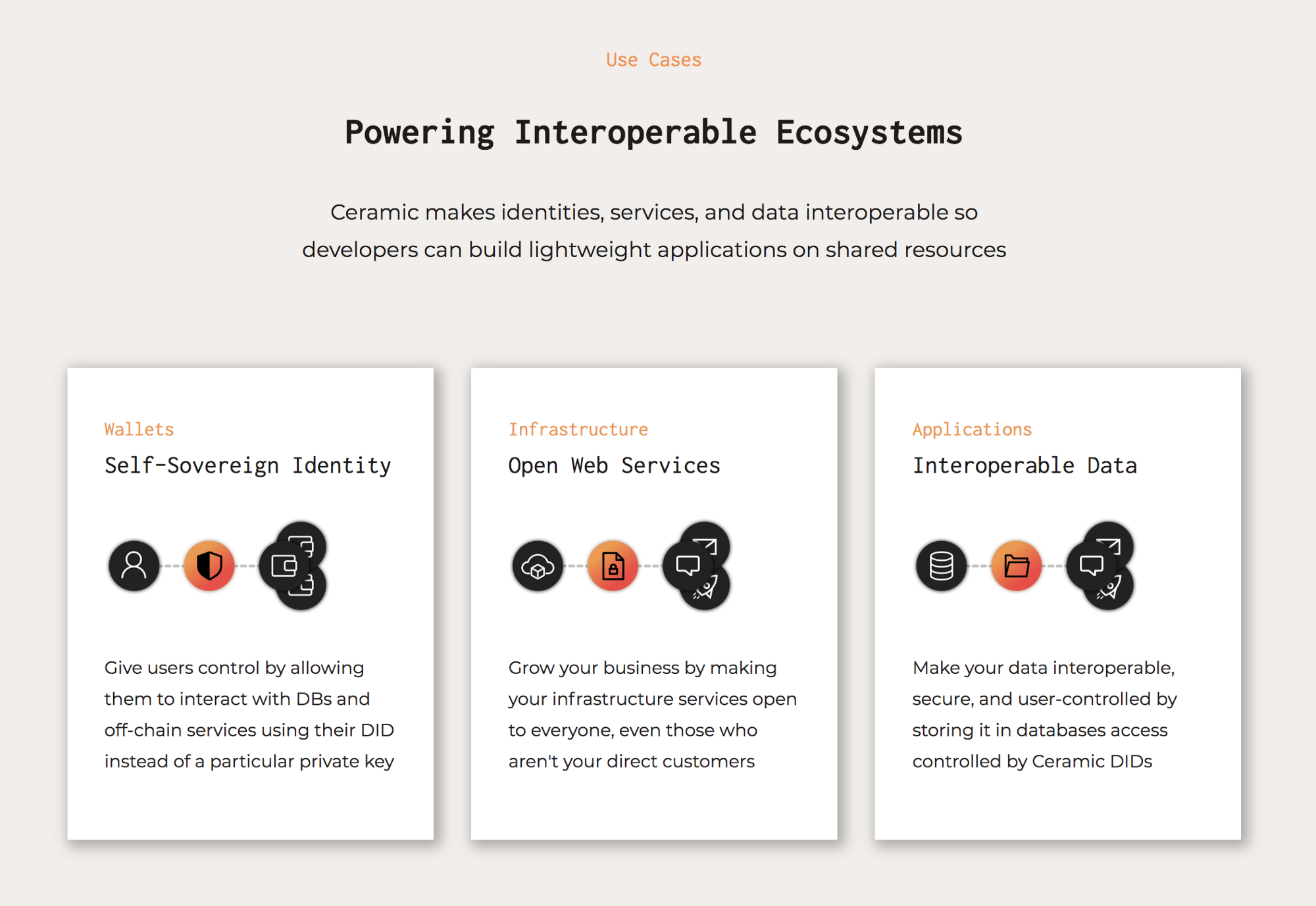 Although Ceramic can be used to store any kind of signed information, it is well-suited as a universal routing layer for storing decentralized identifiers (DIDs) and their associated metadata, data schemas, policies for usage of web services, access control permissions, and other documents that collectively enable boundless interoperability between an ecosystem of connected wallets, applications, databases, and services. Here’s what’s possible on Ceramic: