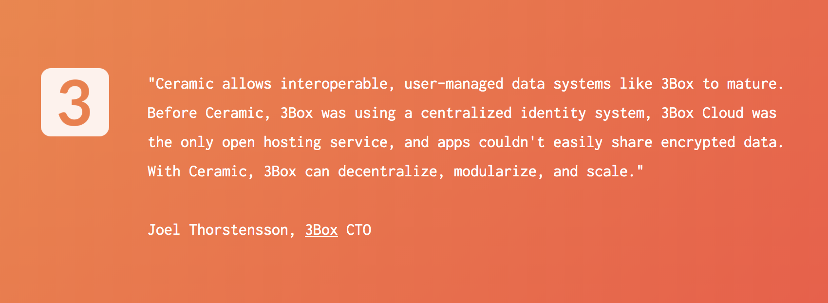 To make everything more concrete, let’s dive into how 3Box relies on Ceramic to enable an interoperable, user-controlled data management system. 3Box is a framework that allows developers to store user and application data on a network of open data hosting services access controlled by users instead of on siloed application servers. Users are always in control of their data and can choose to permission it out to other applications, making it shareable across platforms and applications. To achieve this 3Box relies on self-sovereign identity, interoperable data, and open web services.