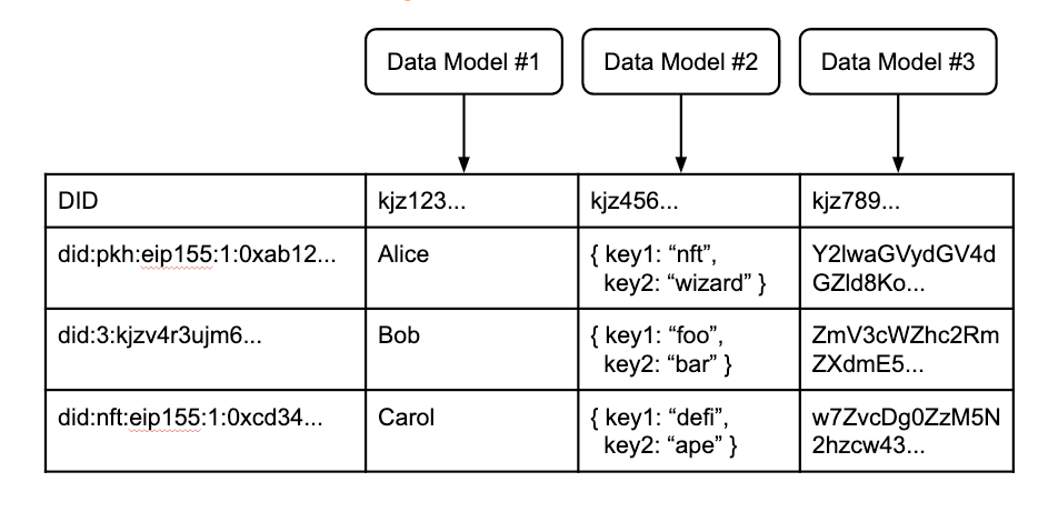 In this table, each row represents a user (DID) and each column is a DataModel (created by an app). Both can be discovered by any user or application and expanded infinitely.